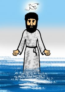 (gambar 001 Yesus dibaptis)Tuhan Yesus juga waktu dibaptis menerima Roh Kudus. Waktu itu Roh Kudus turun dalam bentuk burung merpati (gambar 2). Karena ada Roh Kudus, Tuhan Yesus selalu bisa menyembuhkan orang, bisa berbicara dengan Bapa di Surga, bisa memberi makan banyak orang, dan banyak hal yang hebat lainnya.