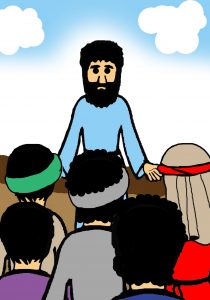 (gambar 001 Yesus sedang mengajar) Waktu itu, Tuhan Yesus sedang duduk mengajar murid-murid-Nya. Jubahnya yang panjang tergerai sampai ke tanah, hampir saja kotor. Adik-adik lihat wajah Tuhan Yesus, biasanya Ia tersenyum dan ramah, tetapi kali ini Yesus mengajar murid-murid dengan serius. Tidak ada canda tawa, tidak ada suara para murid yang berbicara, semua tenang…… dan diam….. Mengapa mereka diam? Karena saat itu Yesus bilang bahwa Dia akan pergi. Di dalam hati murid-murid itu bertanya, “Ha? Pergi? Guru mau pergi kemana? Lalu kalau Guru pergi siapa yang akan menolong kami? Siapa yang akan menjaga kami? Siapa yang akan membela kami? Oh tidaaak. Jangan pergi, Guru, jangaaaan!” Murid-murid sangat kaget mendengar perkataan Tuhan Yesus.